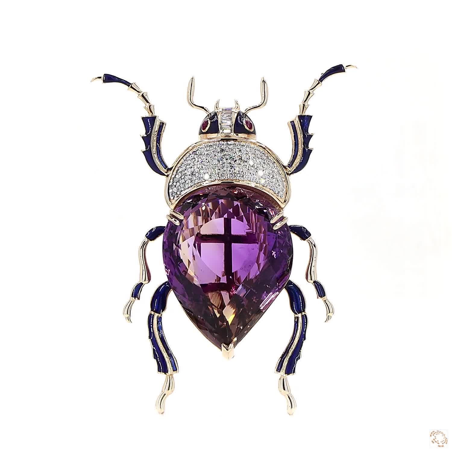 Availability: In StockA beetle is like a tiny builder of the forest and this one has a heart made of a glowing 77 carat ametrine. The stone shifts from purple to honey gold as if it is breathing in the colors of the woods under the visionary eye of Harshad Soni. With its delicate gold legs and curious ruby eyes it looks like it might crawl off your shoulder to tell you a story about the earth. This playful friend reminds us that even the smallest creatures can carry a lot of magic. It is a piece of living art that brings the wonder of nature into your hand.