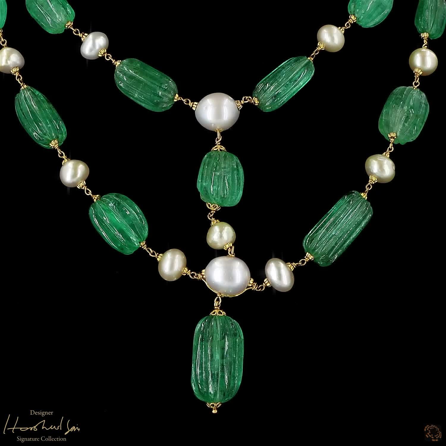 Availability: In StockThis necklace is like a lush green vine that has grown around the treasures of the deep sea. The visionary Harshad Soni used twenty-eight emeralds carved into “melon” shapes and paired them with irregular Keshi pearls. The rose-cut diamonds are tucked between the stones like small sparks of light found deep in a forest. It is a massive and magnificent piece that flows around the neck with the natural grace of a living plant. This suite brings the beauty of the earth and the ocean together in a perfect, never-ending circle of green.