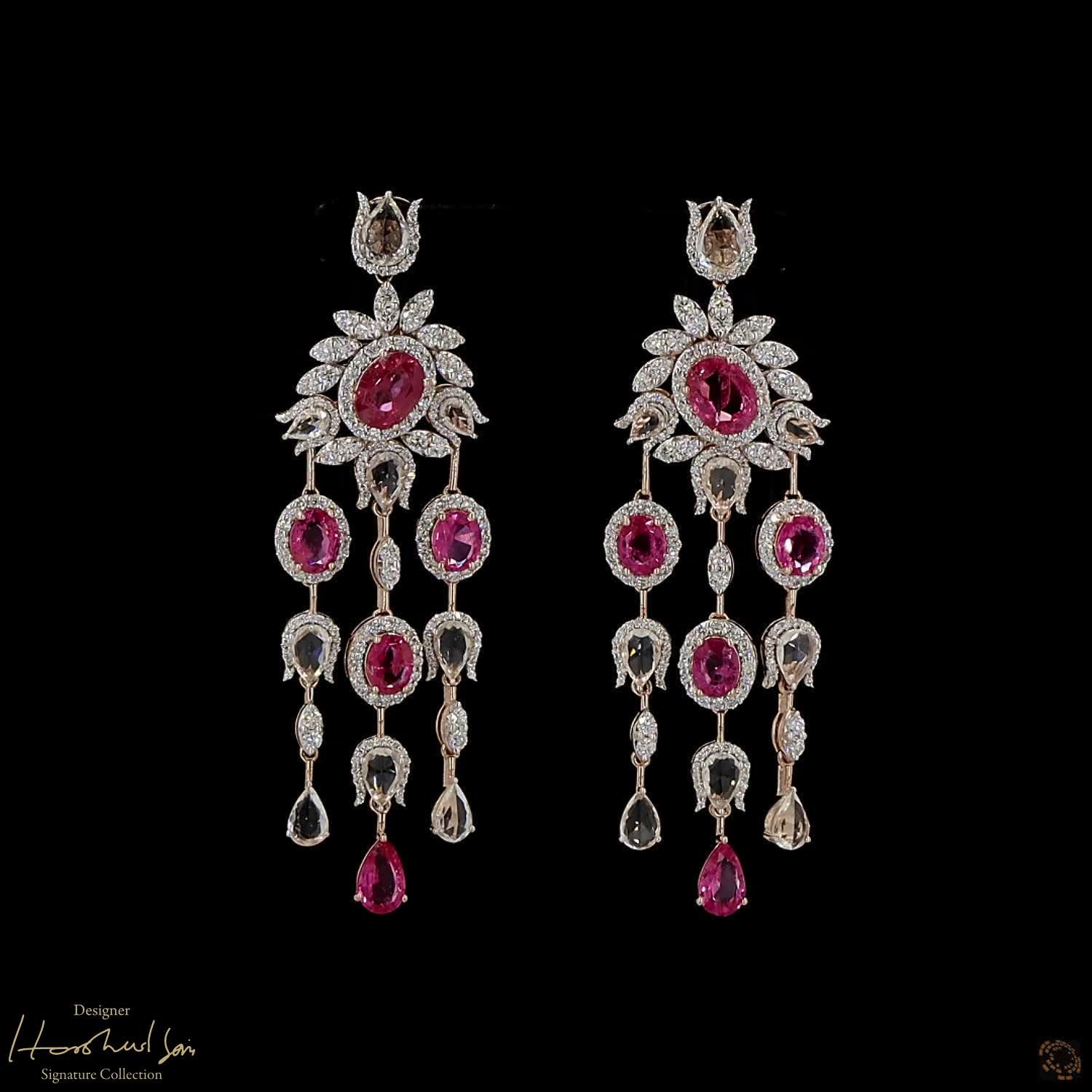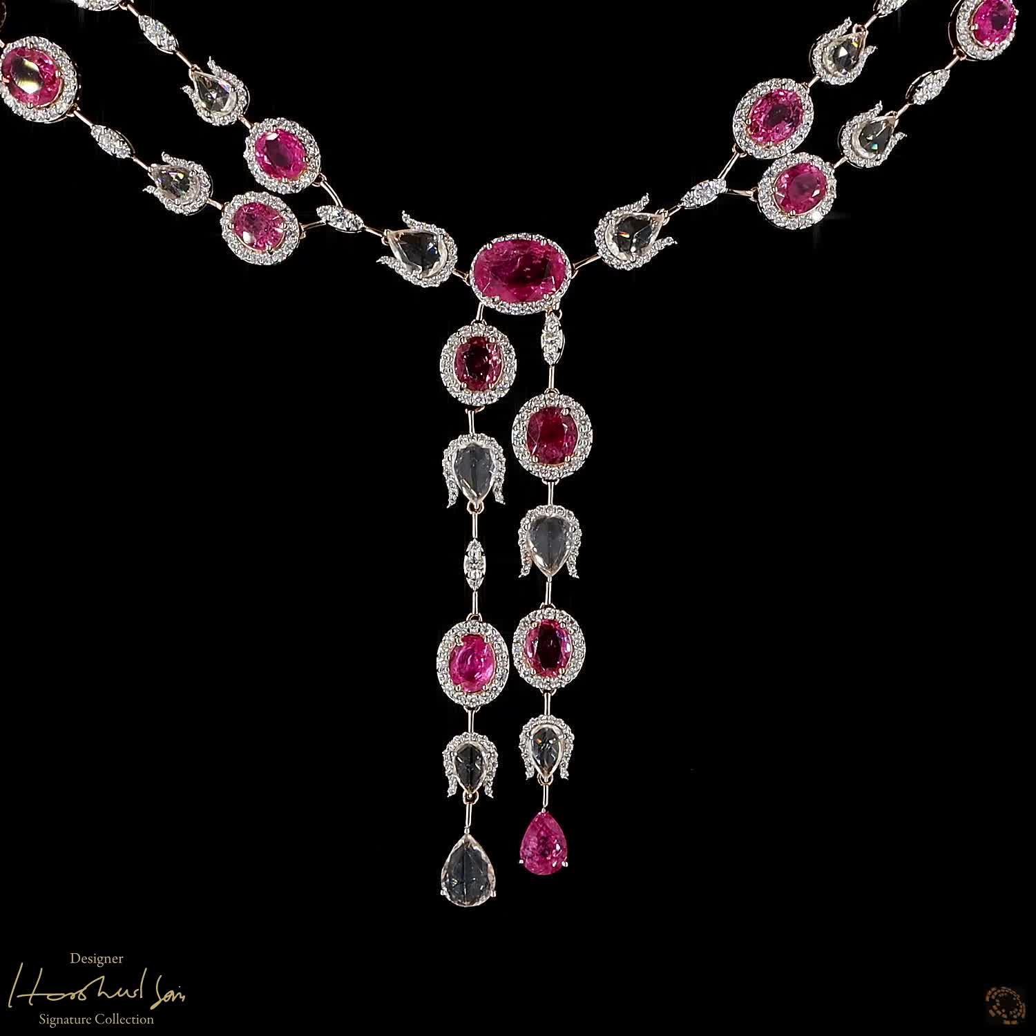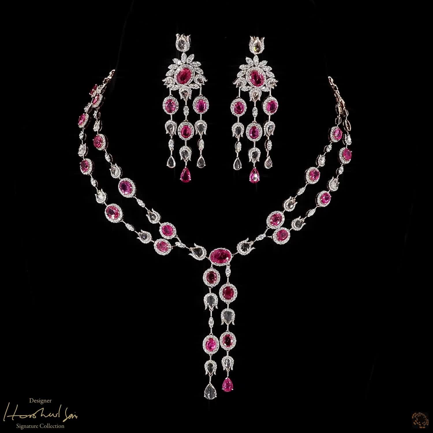 Availability: In StockThis set is all about the soft, romantic colors of a morning sky. The visionary Harshad Soni paired deep pink spinel rubies with clear white sapphires to create a look that is full of light. The white sapphires are “rose-cut” to give them a vintage shimmer that perfectly matches the warm rose gold. It is a graceful and feminine suite that wraps you in a circle of soft, sparkling color.