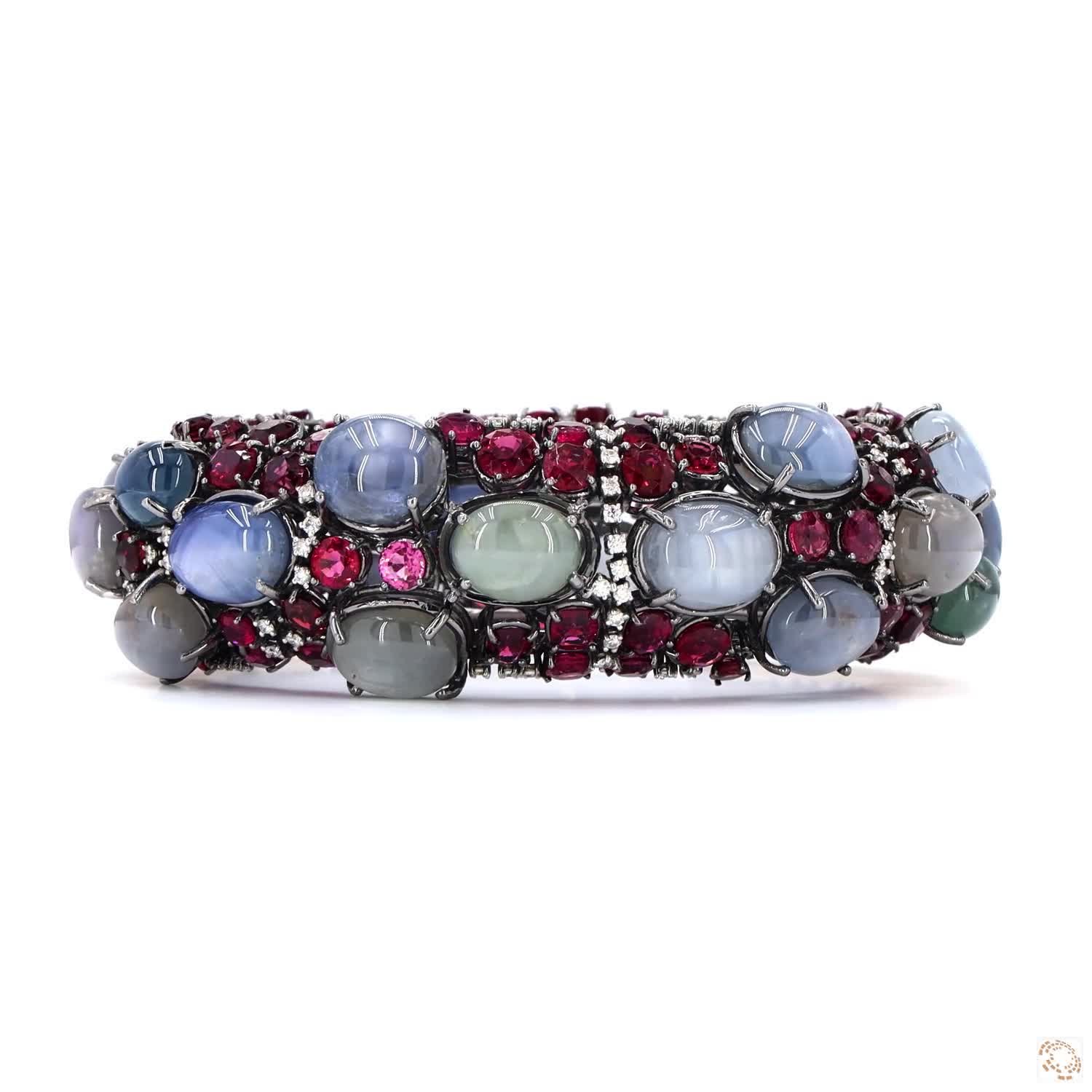 Availability: In StockThis bracelet is like carrying a piece of the night sky on your wrist. The visionary Harshad Soni used 25 star sapphires, which show a hidden six-rayed star when the light hits them. We used a special grey plating and almost a hundred rubies to make the blue stars stand out even more. It is a piece of rare heritage that feels like a cosmic treasure found in a deep cave.