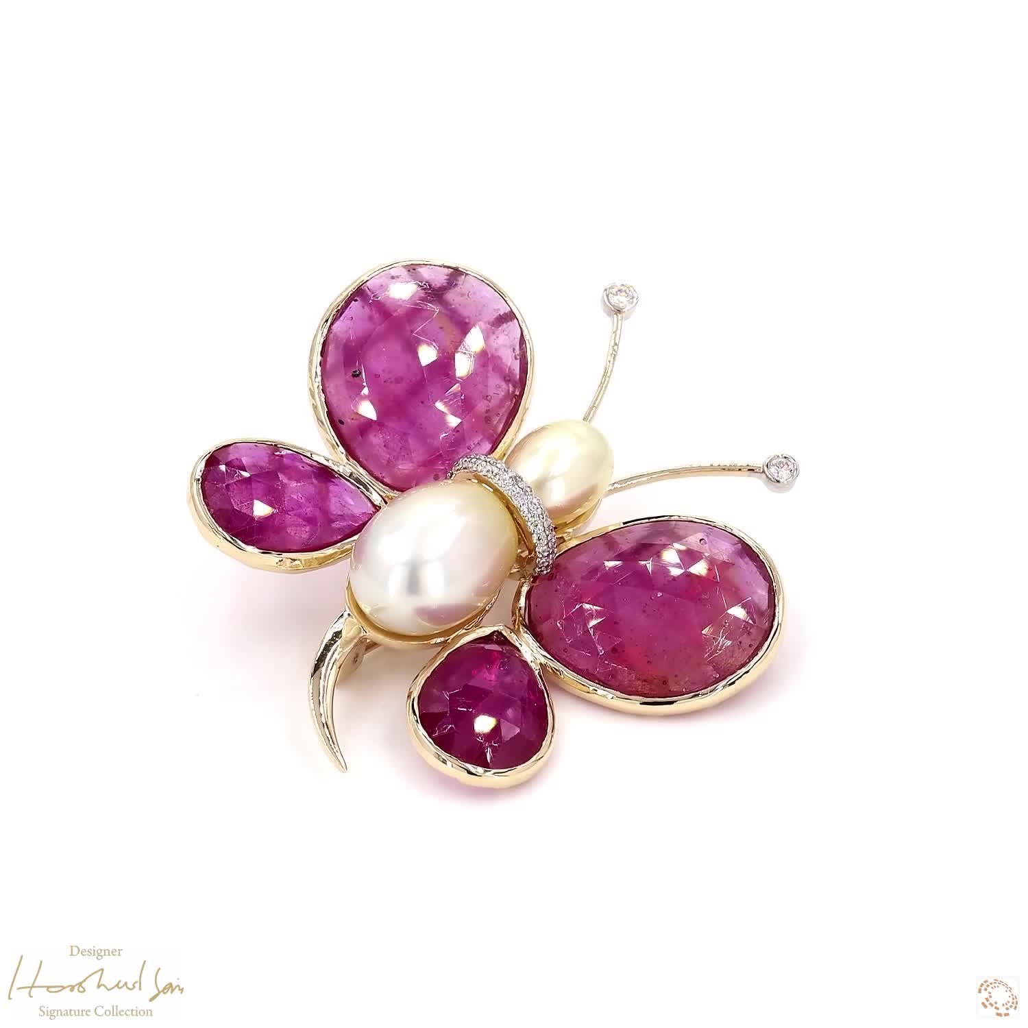 Availability: In StockThis butterfly does not need a flower because it carries its own nectar of fire and light. The visionary Harshad Soni found four rubies from Mozambique that were as red as a setting sun and turned them into wings. To give the creature a body, we used two golden pearls that glow with a soft warmth to balance the heat of the red stones. It looks as though it has just landed on your shoulder to rest before flying back into a beautiful dream. This piece celebrates how the earth can create something heavy and yet make it look as light as air.